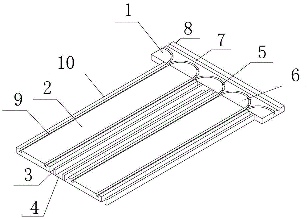 為實現(xiàn)以上目的,本實用新型通過以下技術(shù)方案予以實現(xiàn):一種180度干濕彎頭地暖模塊,包括彎頭模塊本體,所述彎頭模塊本體的一端活動連接有導(dǎo)引模板,所述導(dǎo)引模板的兩側(cè)設(shè)置有地板龍骨槽,所述地板龍骨槽遠(yuǎn)離導(dǎo)引模板的一側(cè)設(shè)置有水泥回填槽,所述彎頭模塊本體的一端開設(shè)有弧度解力引直槽,所述彎頭模塊本體靠近弧度解力引直槽的一端設(shè)置有弧度解力模塊,所述彎頭模塊本體遠(yuǎn)離弧度解力引直槽的一端開設(shè)有固定槽,所述彎頭模塊本體靠近固定槽的一端設(shè)置有隔離承重板,所述導(dǎo)引模板的兩側(cè)開設(shè)有引直槽,所述導(dǎo)引模板靠近引直槽的一側(cè)設(shè)置有固定擋板。